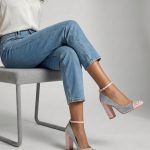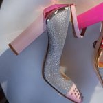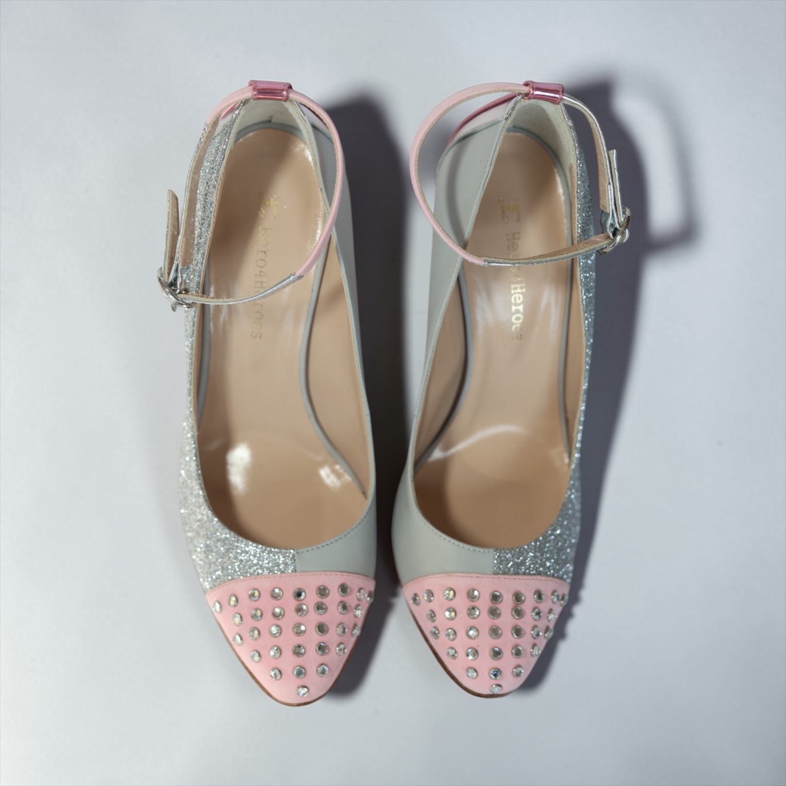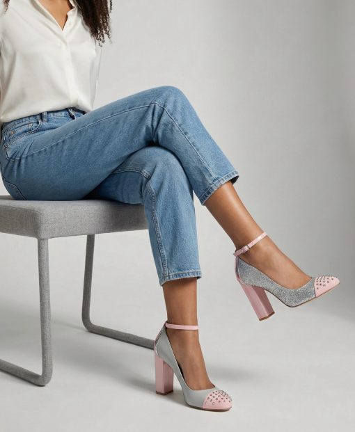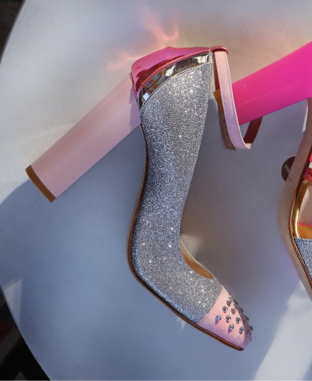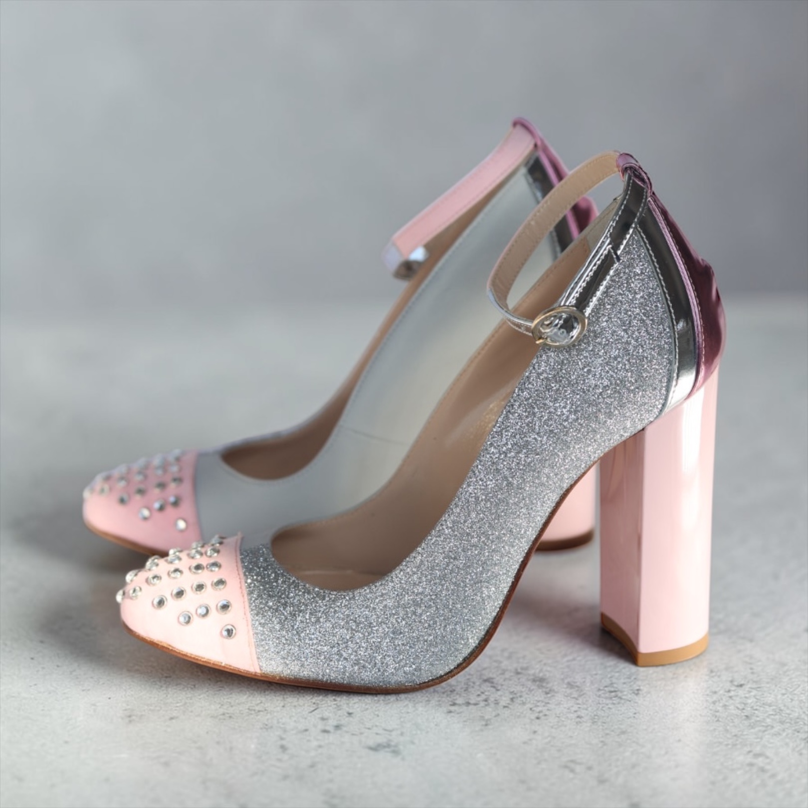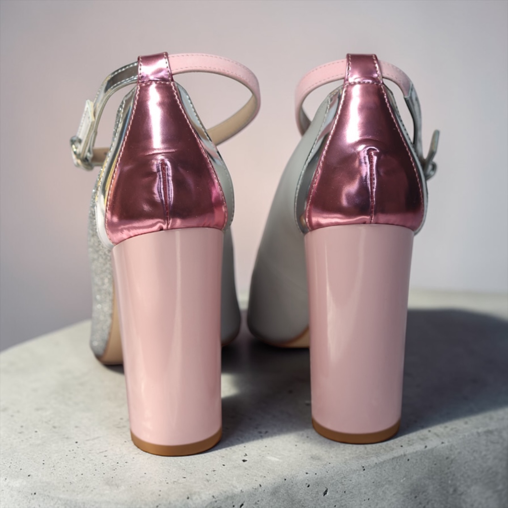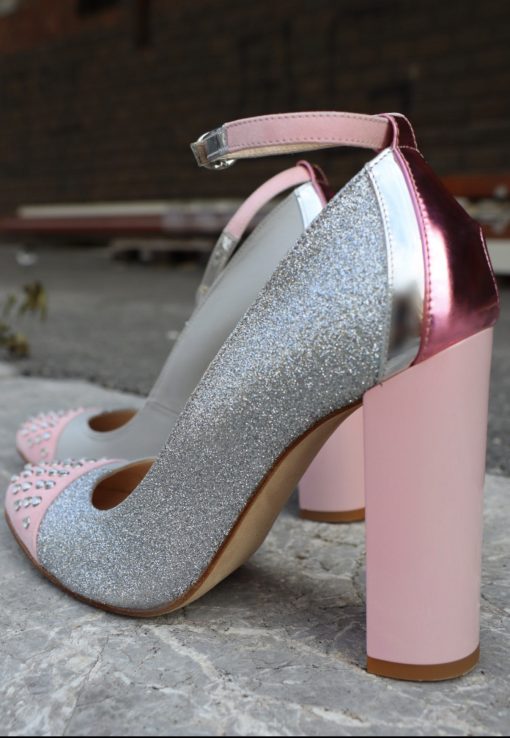 - pink and silver mirrored ankle strap with silver buckle