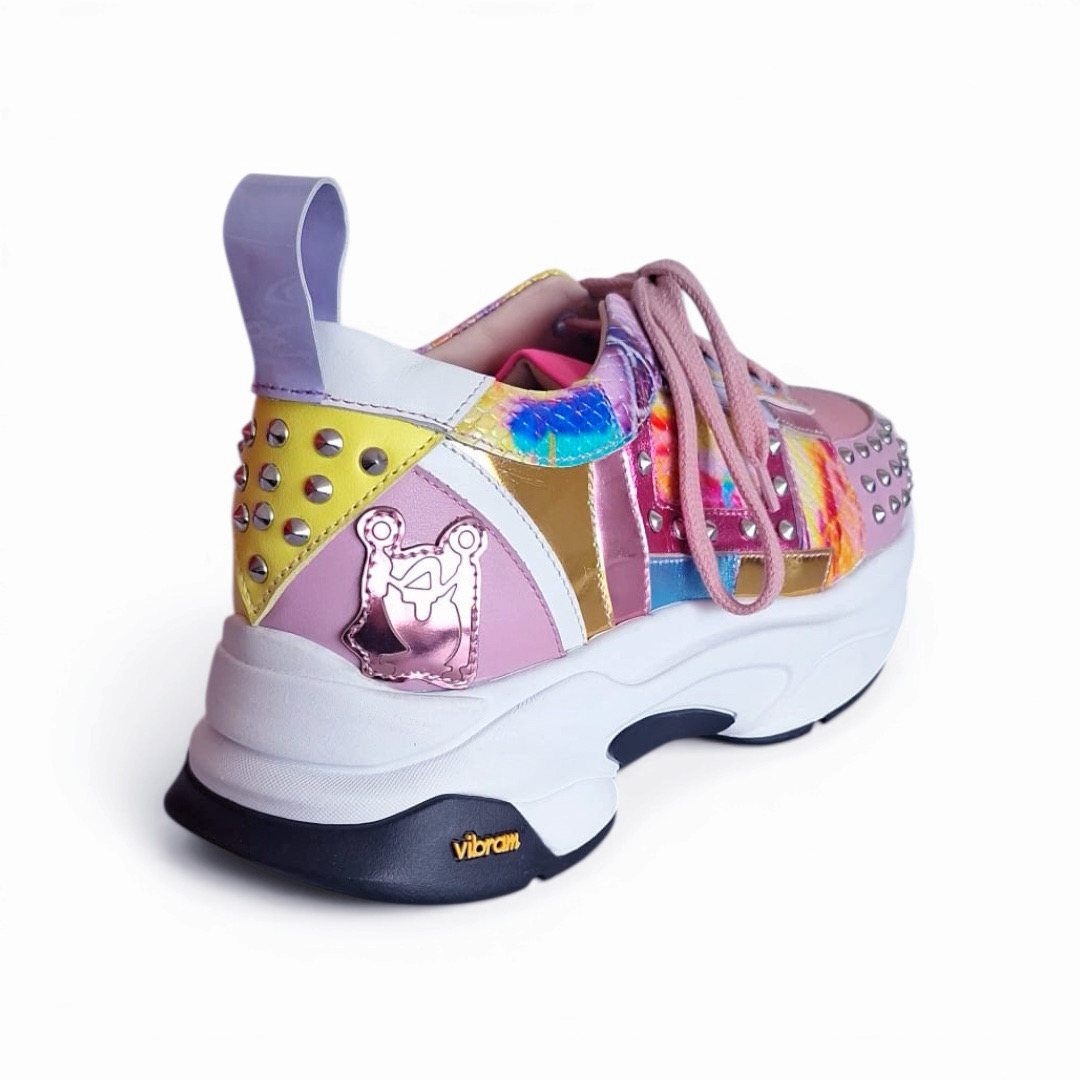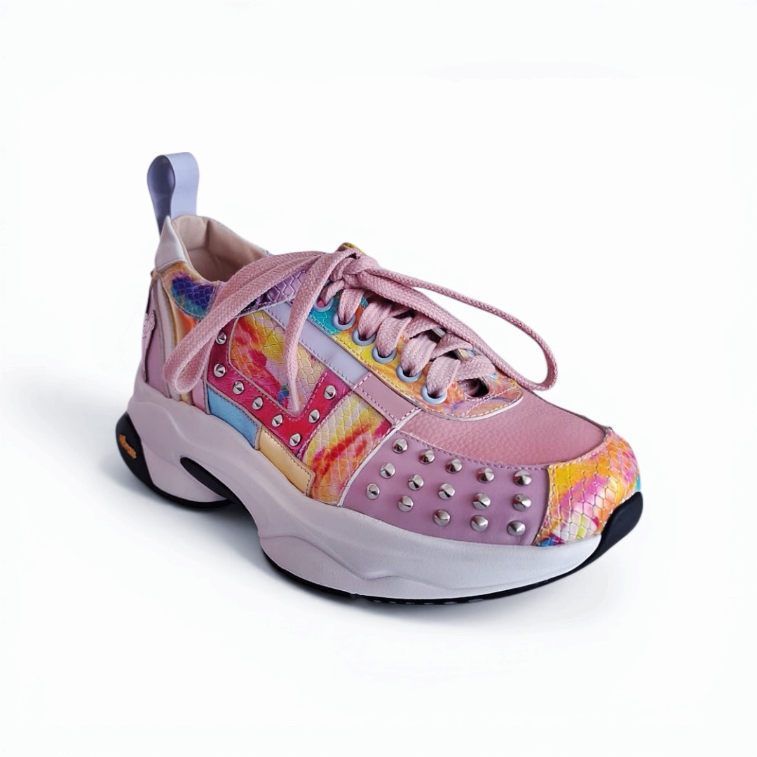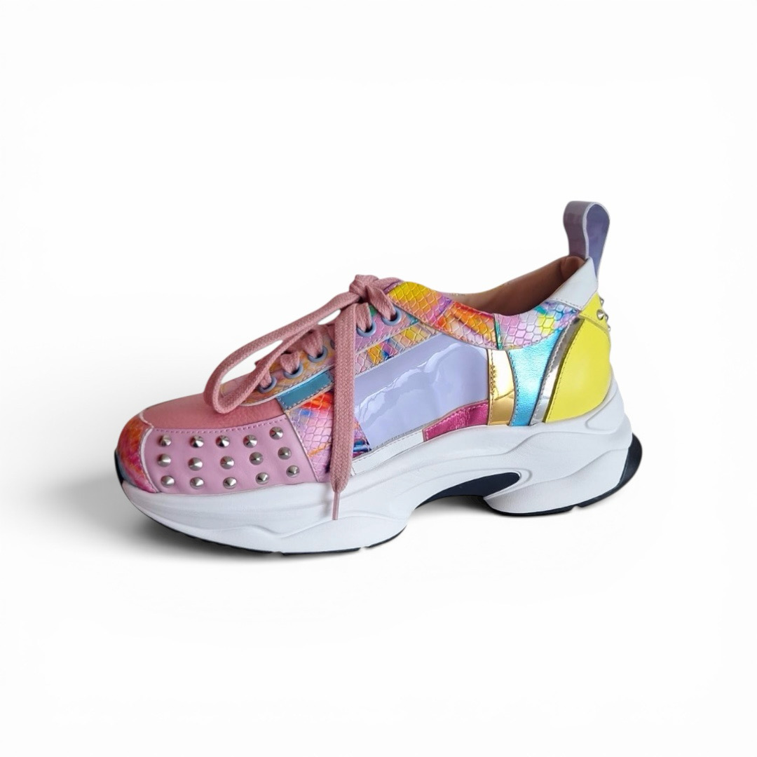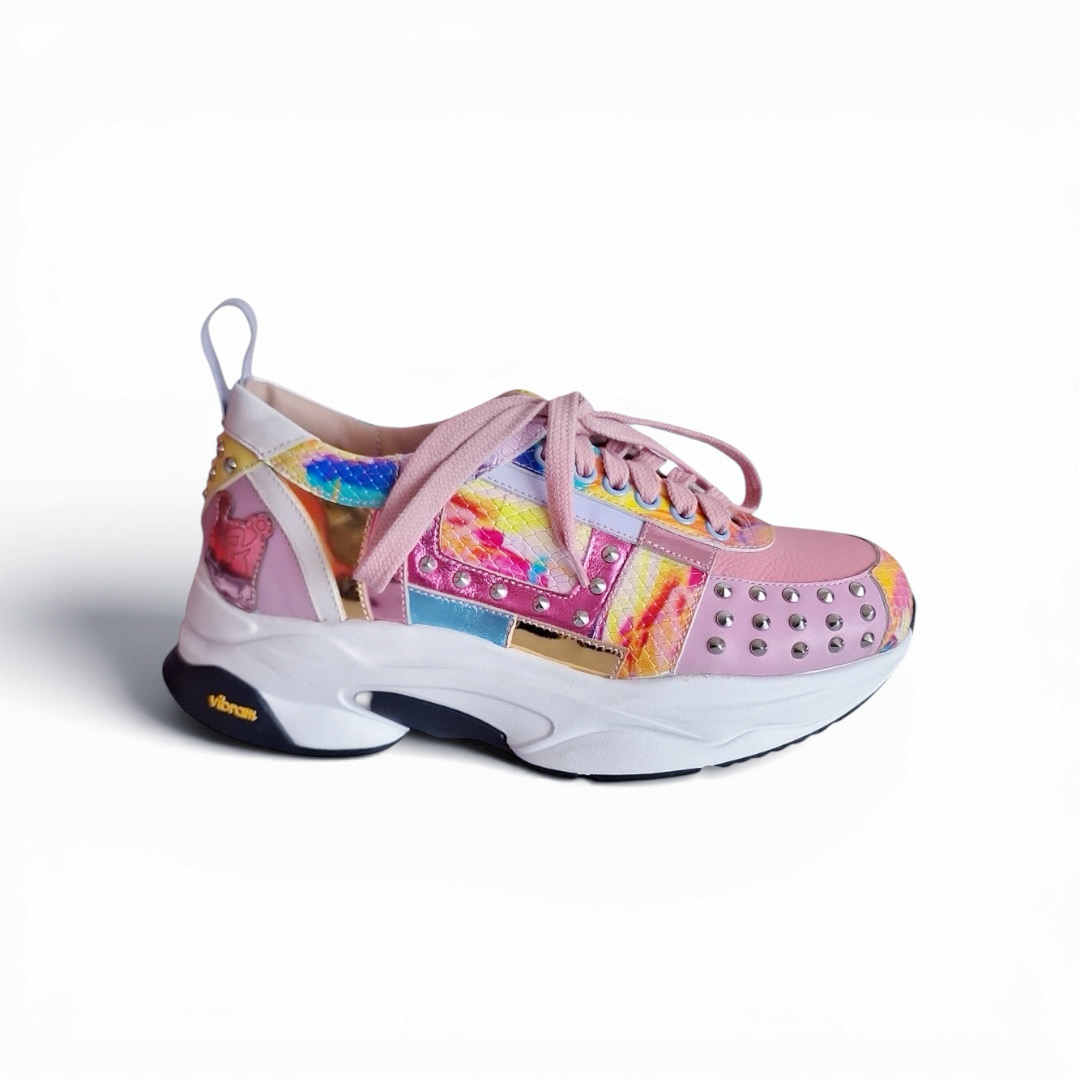 Mirrored leather that reflects the air, neon colors, crystal studs and special printed leather in our art.