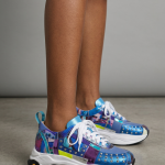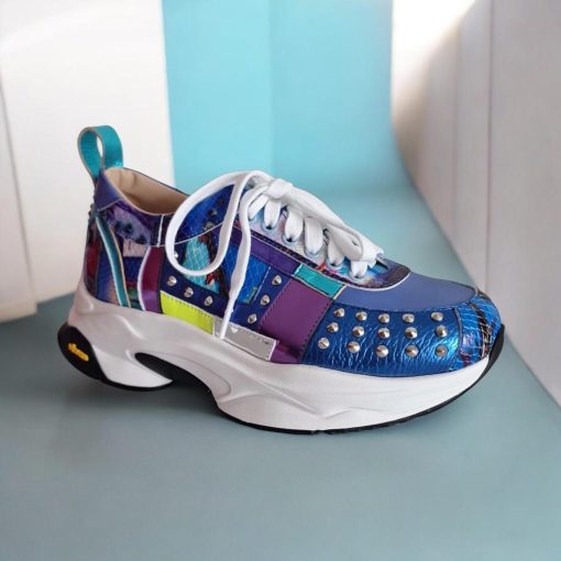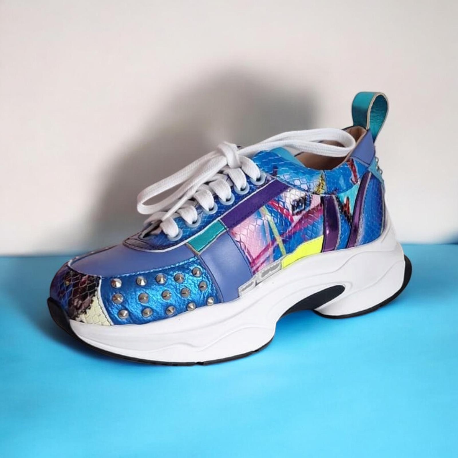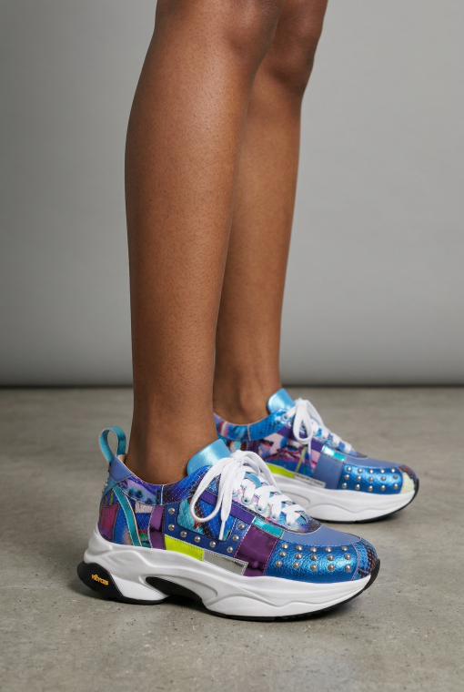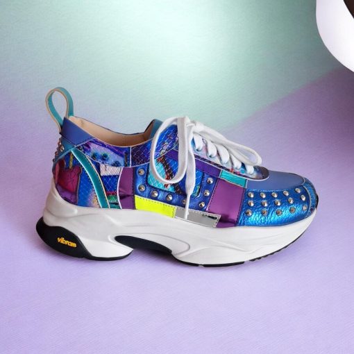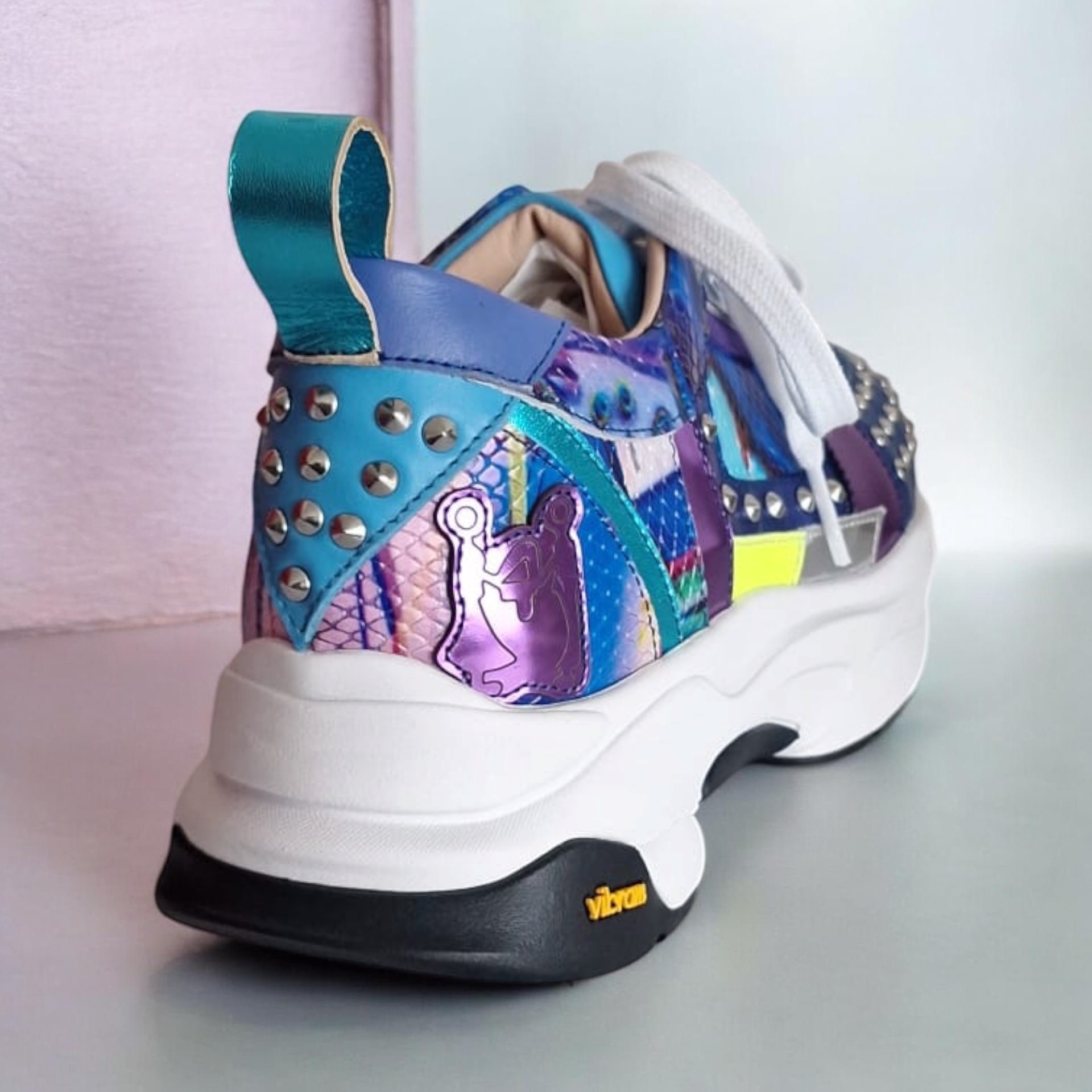 Mirrored leather that reflects the air, neon colors, crystal studs and denim details.