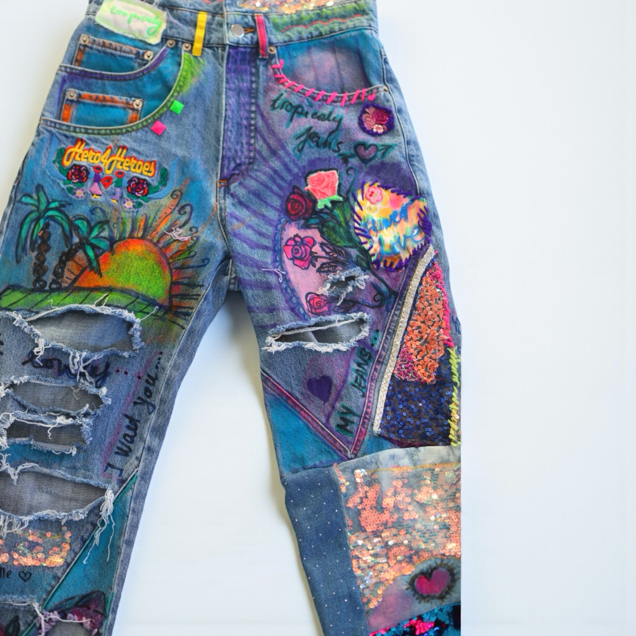 Each pair is hand-painted directly on the denim and reworked with sequins, pearls, and patchwork