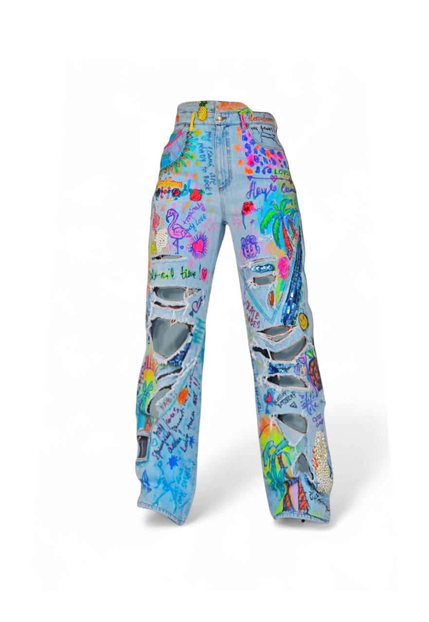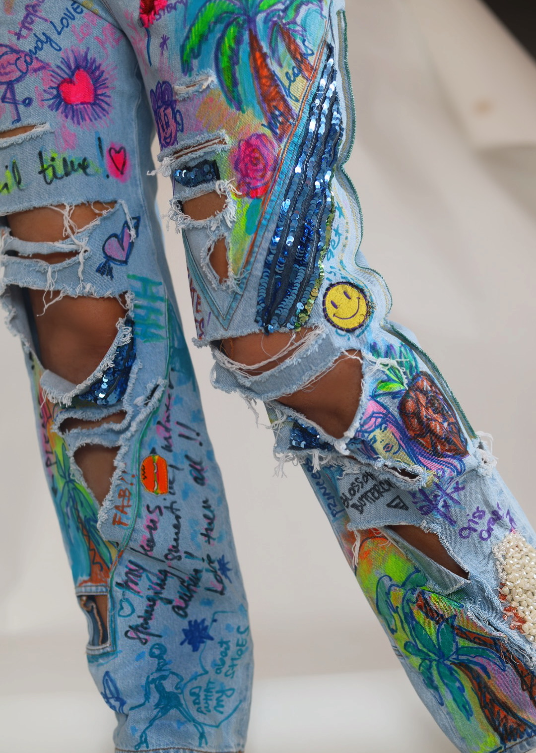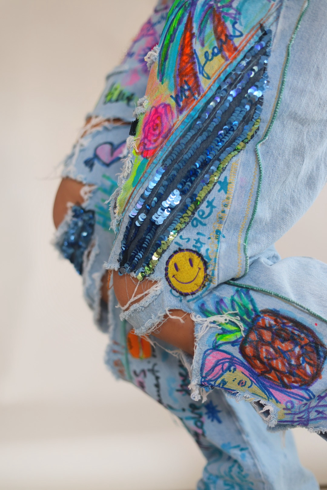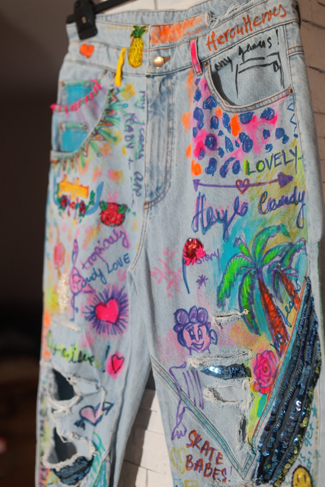 Each pair is hand-painted directly on the denim and reworked with sequins, pearls, and patchwork
