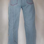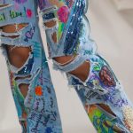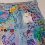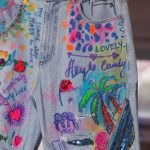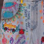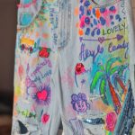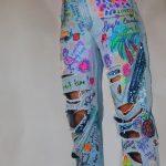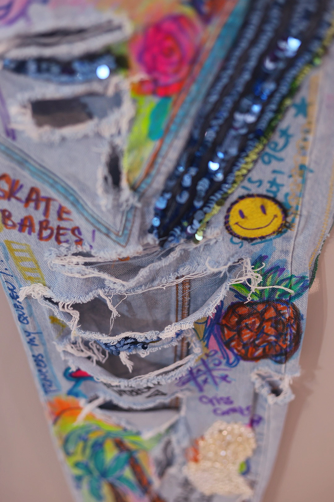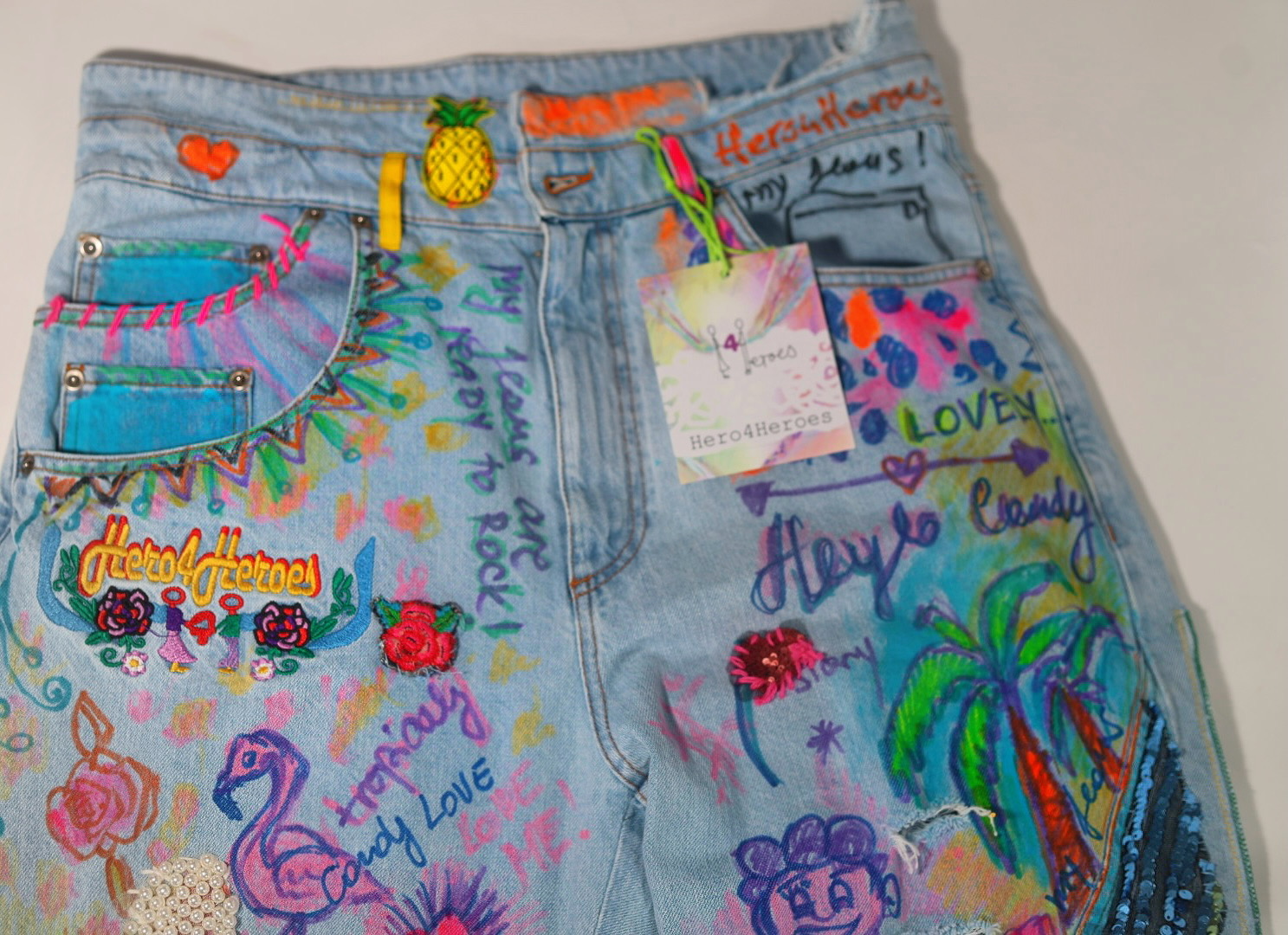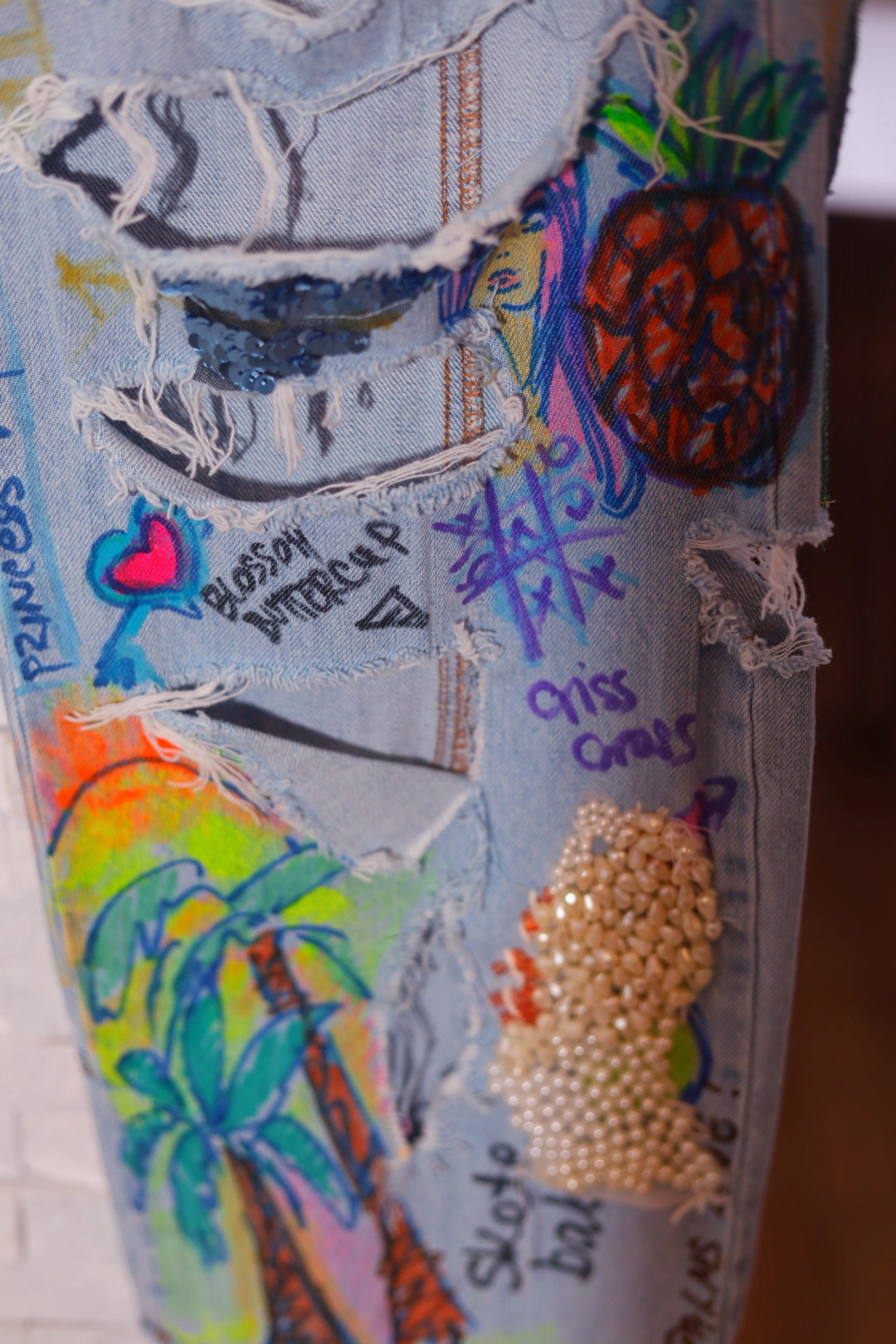 Each pair is hand-painted directly on the denim and reworked with sequins, pearls, and patchwork